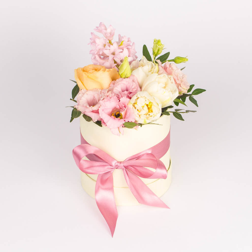 O varianta ideala de cadou este unul dintre cele patru tipuri de aranjamente in cutie rotunda: cu trandafiri si lisianthus, cu narcise, cu lalele si trandafir sau cu zambile si trandafiri peach. Costul este de 97 RON.
