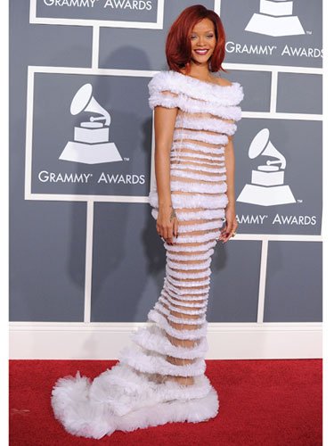 La fel de ridicola a fost si aparitia Rihannei pe covorul rosu de la Grammy, cand a purtat o rochie in dungi orizontale, transparente, semnata de celebrul designer Jean Paul Gaultier.