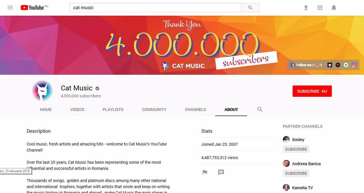 Daca in urma cu sase luni, canalul de YouTube al casei de discuri Cat Music a depasit pragul de patru miliarde de vizualizari, cel mai mare canal de YouTube din Romania stabileste un nou record: 4.000.000 de abonati, depasind zeci de canale din Europa de Est si nu numai.