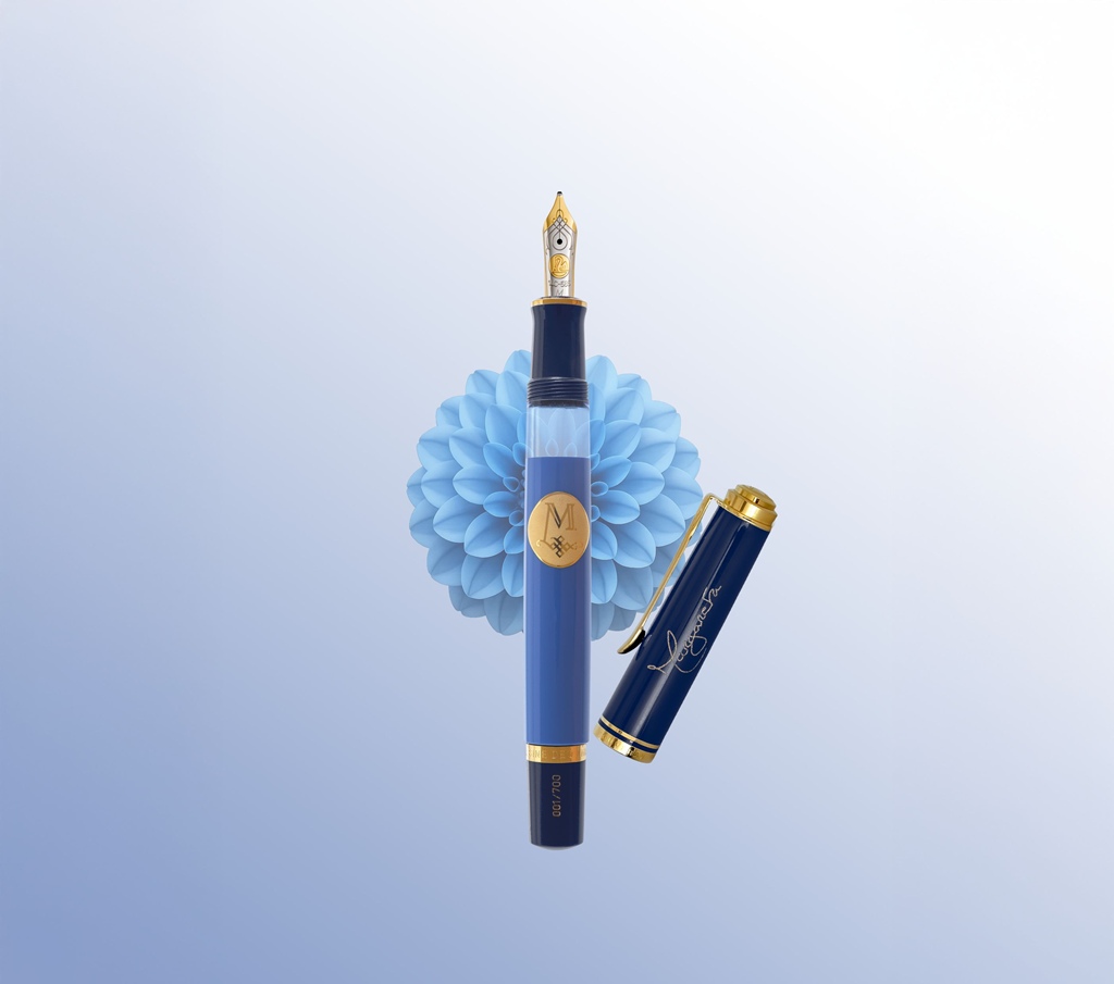 Corpul instrumentului, realizat din rasina de inalta calitate si lustruit cu diamante naturale, capata in timp o stralucire proprie, devenind tot mai valoros prin utilizare. Culoarea stiloului, un albastru regal luminos si rafinat, este pusa in valoare de capacul intr-o nuanta mai profunda, decorat cu accesorii placate cu aur de 24K. Contrastul sugereaza armonia dintre clasic si modern.