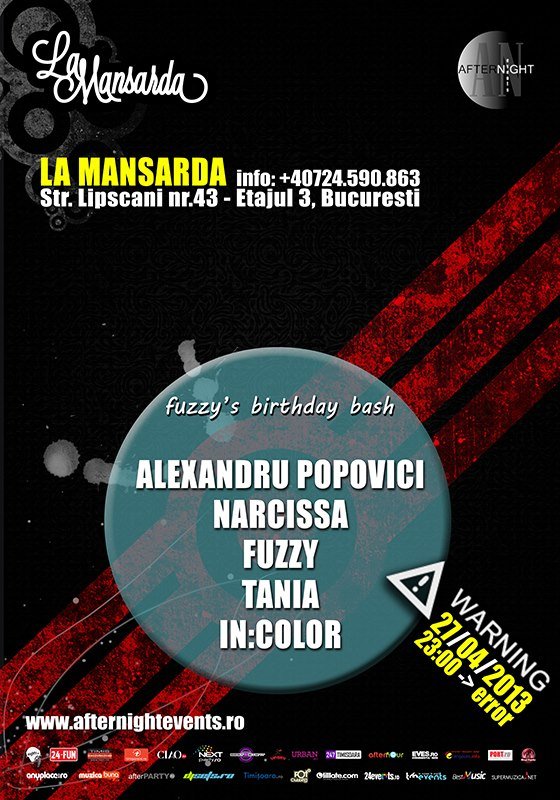 La Mansarda ii are ca invitati pe cei de la AfterNigHt Events, pentru o noapte de sambata cu multa muzica electonica buna. Sambata, pe 27 aprilie, o sarbatorim pe Fuzzy…