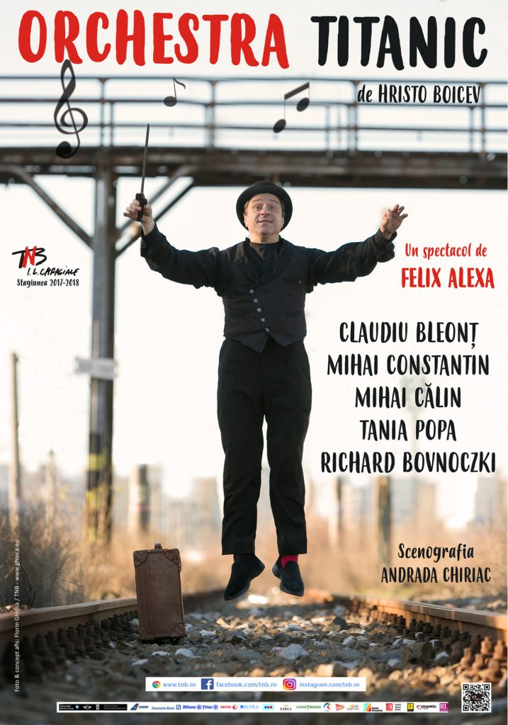 “Orchestra Titanic” de Felix Alexa, cu Mihai Calin, Claudiu Bleont, Tania Popa, Mihai Constantin si Richard Bovnoczki, este o alta comedie propusa de TNB, o poveste despre dorinta de evadare in iluzie. Intr-o gara dezafectata, patru marginali ai societatii asteapta un tren care nu opreste niciodata.